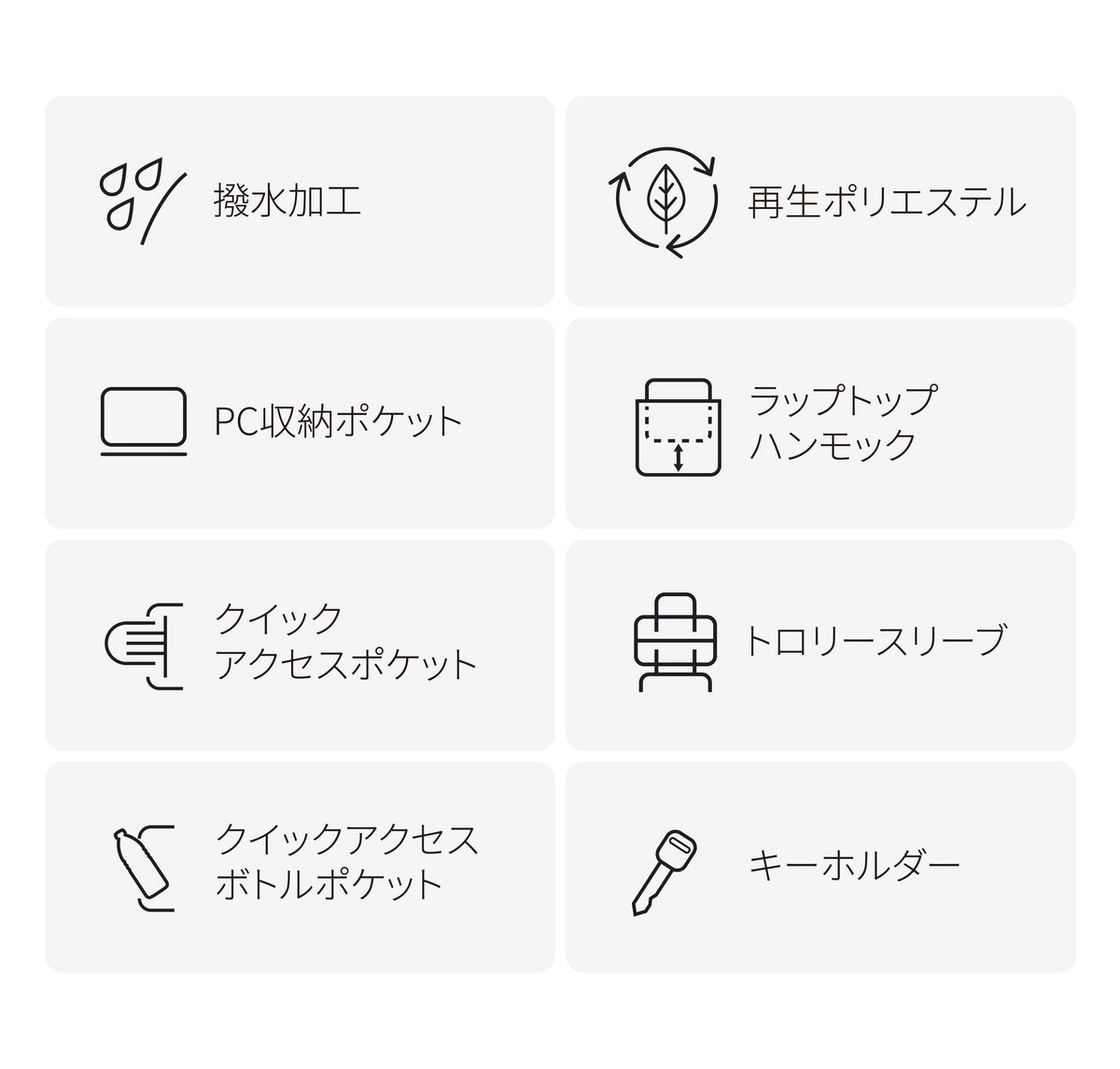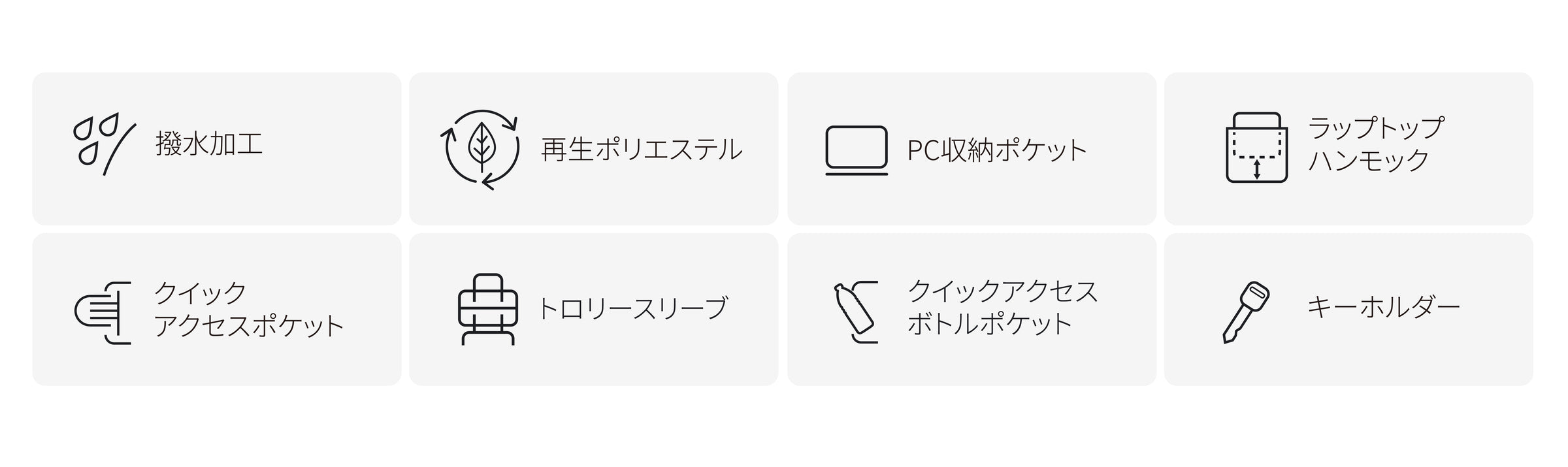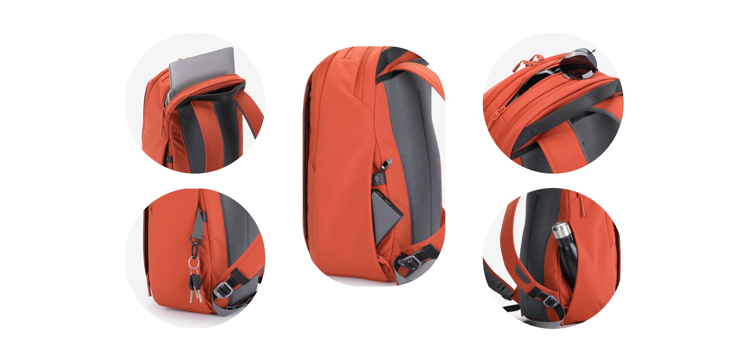 ワークシーンからデイリーユースまで、あらゆるシーンに溶け込むモダンなデザイン。直感的な設計で、必要なものに素早くアクセス。一日中背負っていても、その心地よさは続きます。